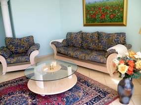 Im Wohnraum werden Sie von verschiedenen Sitzecken erwartet, es gibt einen Essbereich und einen Kamin. SAT-TV mit deutschen Sendern und Internet ist ebenfalls vorhanden.
