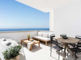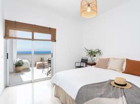 Von der privaten möblierten Terrasse aus, welche durch das Schlafzimmer erreichbar ist, hat man den Blick auf den Strand und das Meer aus erster Reihe. Im Schlafzimmer befindet sich ein Doppelbett (180x200cm), zu dem auf Anfrage ein Babybett hinzugestellt werden kann.