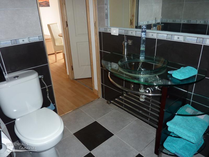 Bad mit separatem Duschbereich, Glas-Waschtisch, Fenster mit Blick zum Teide und Kletterfelsen.