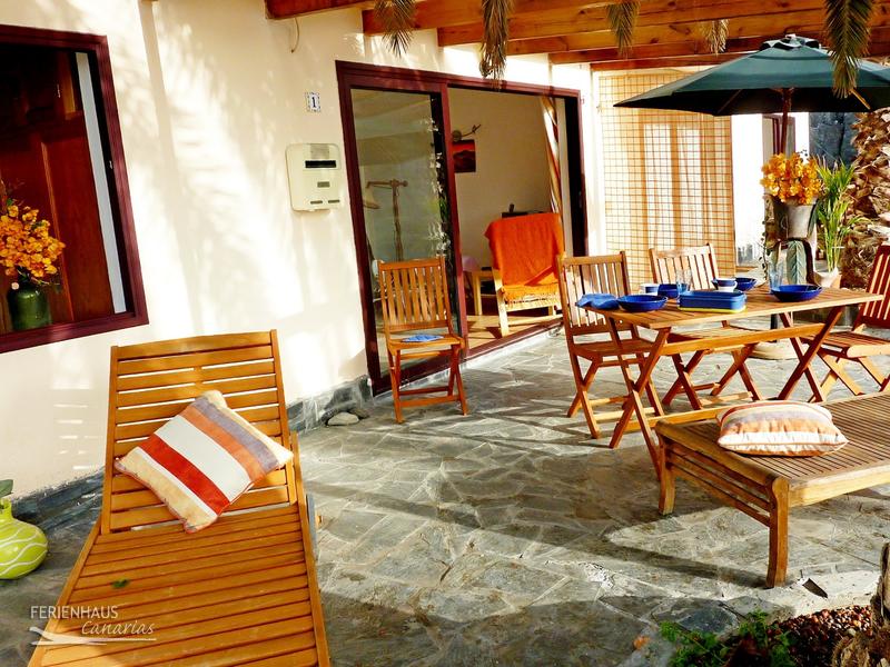 Die Naturstein-Palmen-Terrasse (ca. 20 m² groß) mit traumhaftem Blick zum Teide, zur Küste und Bucht bietet Sonnengenuss pur unter der Pergola mit Hängematte, Sitzgruppe mit Sonnenschirm und BBQ Grill.