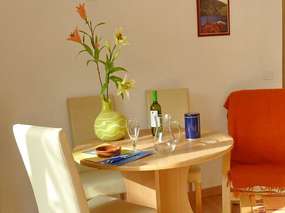 Die Ferienwohnung verfügt über einen Wohnraum mit offener Küche, Essecke mit Tisch und 3 Sesseln, Queensize-Schlafcouch (für 3. Person), SAT-TV und Home-Cinema TV, Radio sowie Panoramafenster mit Blick auf die Küste.