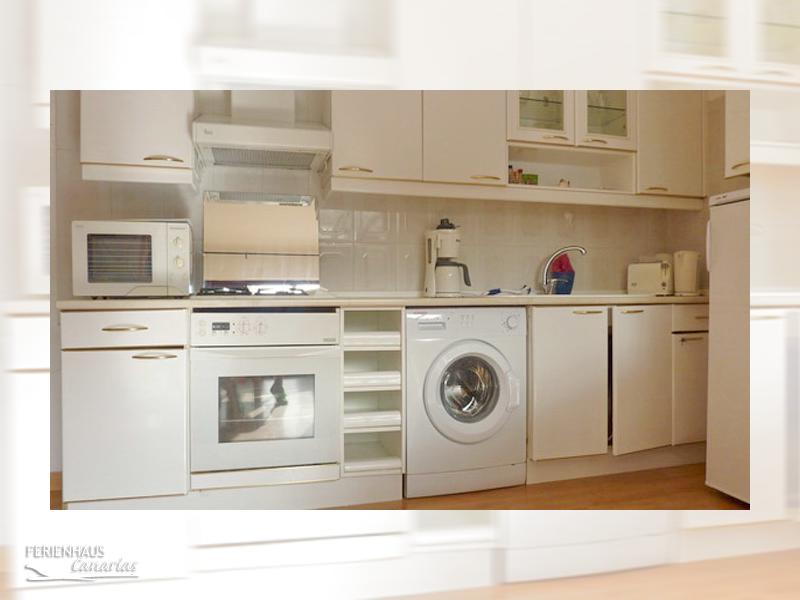 Küchenzeile mit Waschmaschine, Backofen, Mikrowelle, Kochfeld mit 1 Elektro- und 3 Gaskochstellen, Kühlschrank mit extra Gefrierfach, Toaster, Kaffeemaschine, Wasserkocher, Geschirr und Küchenutensilien.