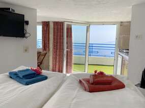 Das Besondere am Apartment Atlantico ist seine Aufteilung. Obwohl es eigentlich ein Studio ist, wirkt es durch seine Aufteilung, die Nutzung der großen Dachterrasse und dem separaten Bad sowie WC viel größer. Es bietet eine kleine eingebaute Küche, einen Essbereich, Smart TV mit Netflix und dem Blick vom Bett auf den Atlantik. Auf der großen Terrasse vor dem Raum kann man wunderbar auf bequemen Liegen entspannen. Am Außentisch kann mit Blick auf den Atlantik seine Mahlzeiten oder Getränke genießen. Von der Terrasse hat man auch den Zugang zu Dusche und WC.