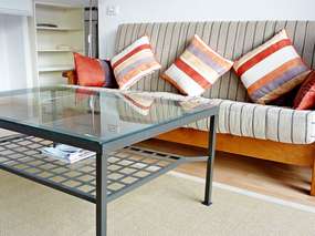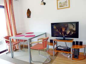 Eine Ferienwohnung mit Blick aufs Meer, Küste, Teide, Strandzugang (200 m) mieten. Wohnzimmer mit Essecke 3 Sesseln und queensize-Schlafcouch Tisch, SAT-TV und Home-Cinema TV, Radio, sowie Panoramafenster mit Blick auf die Küste.