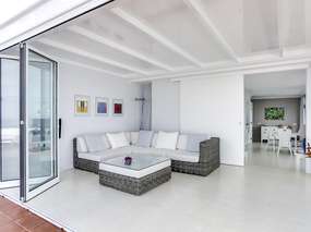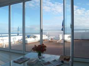 Das Wohnzimmer ist auf zwei Seiten verglast und mit Lounge-Möbeln ausgestattet, so dass sich hier ein Chillout-Ambiente ergibt.