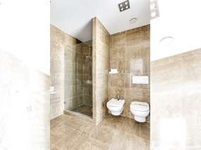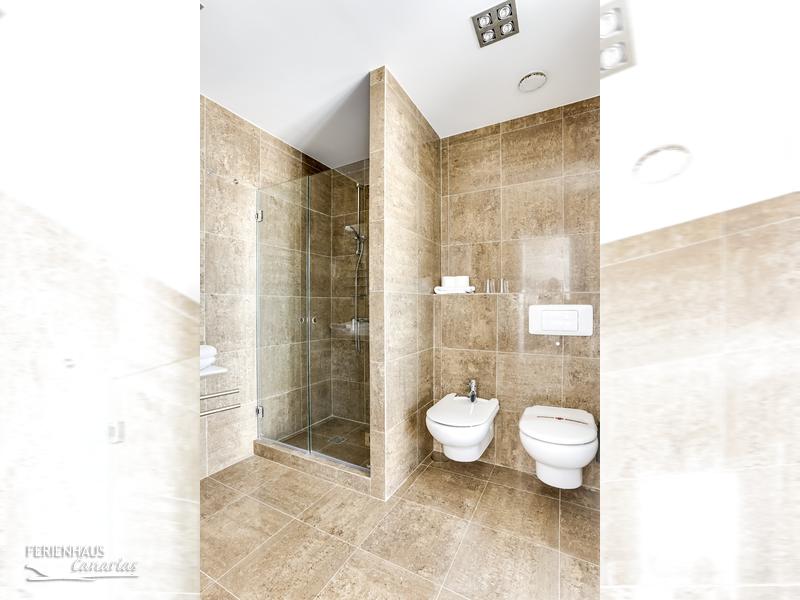 Das Badezimmer empfängt Sie mit einem einer Dusche, dem WC, einem Bidet und einem großen Waschtisch.