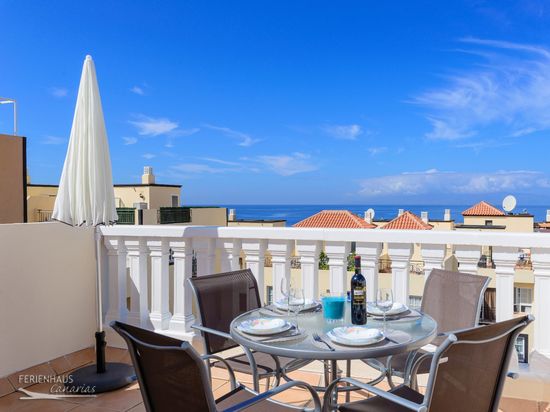 Zur Ferienwohnung gehört eine Dachterrasse von ca. 10m² mit Blick über die Dächer hinweg aufs Meer und den Pool. Es gibt hier einen Grill, Tisch und Stühle sowie Sonnenliegen.