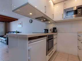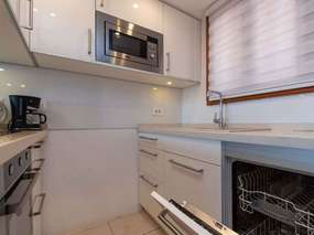 Im offenen Wohn- und Essbereich finden Sie auch die gut ausgestattete Küche. Die Kochinsel sorgt für optische Trennung vom Rest des Raumes. Es gibt eine Sofaecke und einen weiteren Fernseher mit SAT-TV (auch deutsche Fernsehkanäle)