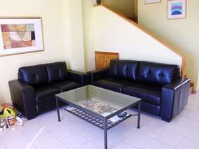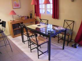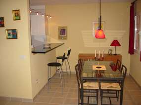 Für gemütliche Abende gibt es im Wohnbereich eine Sofaecke mit Fernseher und deutschen Kanälen sowie eine Stereoanlage. Von hier aus gelangen Sie auf die geräumige und möblierte Ostterrasse. Die Küchenzeile ist offen in den Wohnraum integriert, eine Bar trennt die Essecke von der Küche. Die Ausstattung umfaßt unter anderem auch einen Backofen, Ceranfeld, Mikrowelle, Spülmaschine, Kühl- und Gefrierkombi, Kaffeemaschine und Wasserkocher.