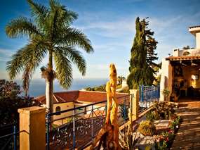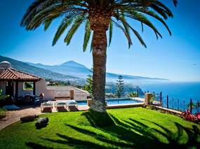 Die Villa besticht durch ihr gemütliches und zugleich exklusives Ambiente. Im großen Palmengarten mit vielen grünen Pflanzen befinden sich der per Wärmepumpe klimatisierte Pool (etwa 25°), Größe des Pools etwa 3 x 8m, sowie eine Außendusche, Sonnenliegen und mehrere Terrassen mit vielen lauschigen Plätzen. Eine Aussensauna mit Meerblick und ein Jaccuzi steht den Gästen exclusiv zur Verfügung. Es wird ein fantastischer Panoramablick auf die gesamte Küste, vom Vulkan Teide, über die Stadt Puerto de la Cruz bis hin zum unendlich weiten Atlantik geboten. Aufgrund der Südwestlage werden einem atemberaubenden Sonnenuntergang in den Abendstunden geboten.