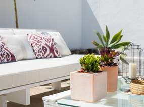 Terrassen gibt es vor und seitlich vom Haus, natürlich mit entsprechenden Gartenmöbeln. Das Grundstück ist in sich abgeschlossen, auch ideal wenn Sie mit kleinen Kindern reisen. Vor allem aber - haben Sie Ihre Ruhe und Privatsphäre im Urlaub.
