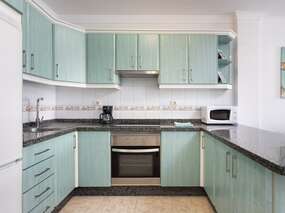 Zum Wohnbereich gehören wie üblich eine Sitzgarnitur, sowie ein Fernseher mit Sat-Empfang (dt. Programme). Die Einbauküche ist mit allem eingerichtet, was Sie zum Kochen im Urlaub brauchen. Sie verfügt unter anderem über eine Kühl-/Gefrierkombination, einen Ceranherd mit Backofen, Kaffeemaschine, Mikrowelle, Wasserkocher. Seitlich gibt es einen Essbereich.