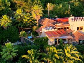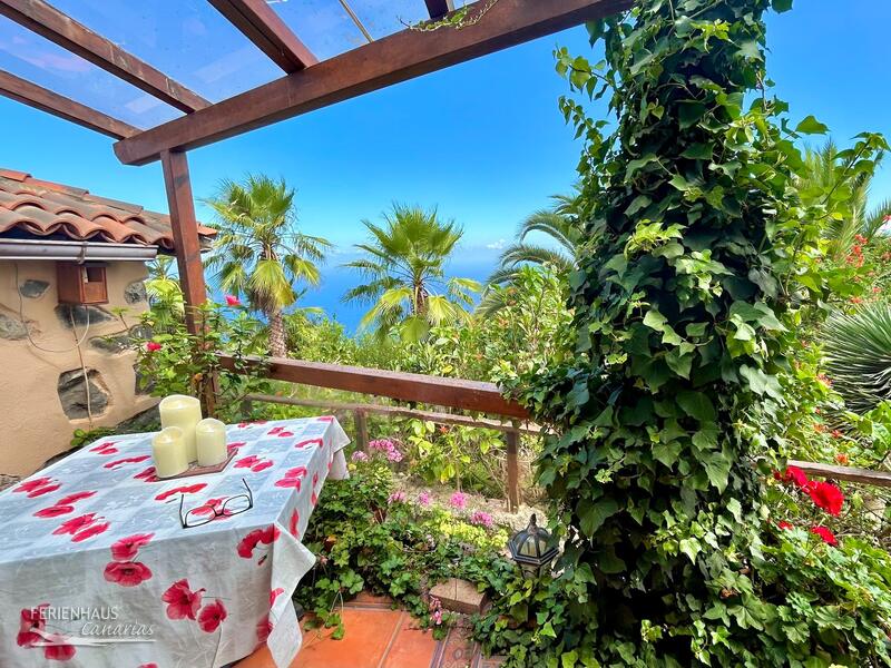 Wohnen Sie auf einer schönen Gartenfinca mit traumhaften Meerblick, in einem freistehenden, Einraum-Häuschen umgeben von tropischen Pflanzen, Obst, Wein und Blumen.