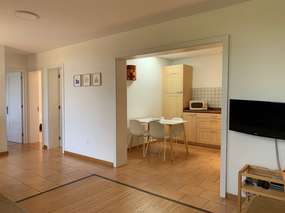 Im Wohnbereich befindet sich ein großes bequemes Sofa, ein Fernseher mit Sat-TV und ein Laptop, der Ihnen mit Internet zur Verfügung gestellt wird. Die Küche ist modern und gut ausgestattet und hat einen Essbereich mit Tisch und Stühlen.