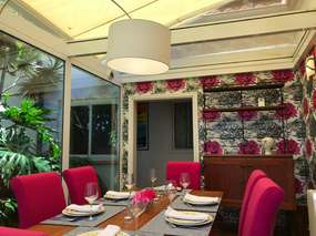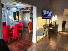 Das Wohnzimmer mit gemütlichen Sitzecke liegt zum Garten und das Esszimmer ist im Wintergarten untergebracht, in dem sich neben der Essgruppe auch der Geschirrschrank befindet. Die Küche ist offen, hell und sehr gut ausgestattet, unter anderem mit: Kaffeemaschine, Wasserkocher, Toaster, Kühl- / Gefrierkombi, Herd, Backofen, Mikrowelle sowie auch eine Spülmaschine und ein Weinkühler. Töpfe, Pfannen, Gläser, Geschirr, Besteck und alles andere, was zum Kochen benötigt wird.