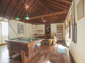 Wenn man die Treppe hinaufgeht, findet man ein helles Wohnzimmer mit verschiedenen Atmosphären, von einer Spiel- und Leseecke für Kinder bis zu einem großen Raum zum Entspannen und Fernsehen mit stilvollen Möbeln und einer großen Bibliothek mit verschiedenen Themen, unter denen die kanarischen Themen Natur, Kunst und Traditionen hervorstechen. Vom Wohnzimmer aus gelangt man in einen Flur mit Arbeitsbereich und Blick auf die Bäume im Innenhof mit einer Bank, Sesseln und Tischen sowie 2 Liegestühlen. Dieser Korridor führt auch zu den beiden Doppelschlafzimmern und dem Badezimmer.