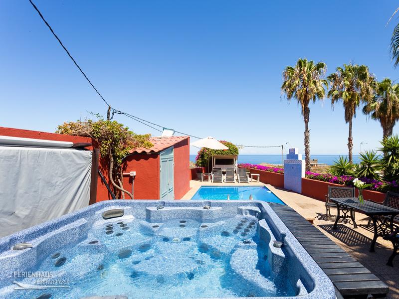 Die gesamte Finca ist sehr gepflegt mit vielen Pflanzen. Es gibt verschiedene Terrassen und Ausblicke in Richtung Meer, umliegende Landschaften oder auf den alles überragenden Teidegipfel. Den ganz besonders schönen Meerblick hat man von der Poolterrasse aus. Hier ist auch der Whirpool der sowohl warm als auch unbeheizt benützt werden kann.