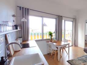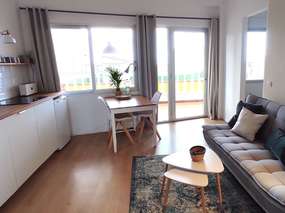 ist ausgestattet mit einem Doppelbett 160 x 200 cm. Im Wohnzimmer gibt es eine Couch die sich zu einer weiteren Schlafmöglichkeit (120 x 200cm) für eine weitere Person ausziehen lässt. Es gibt einen Esstisch mit Stühlen ein Smart TV mit deutschen Programmen. Die Küchenzeile ist ausgestattet mit Herd, Mikrowelle, Kühlschrank, Geschirr und Kochutensilien. Es gibt einen großen Sonnenbalkon mit Blick ind die Fussgängerzone. Auf dem Balkon gibt es bequeme Sessel und einen Tisch.