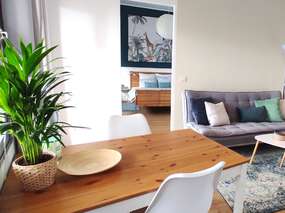 50 qm sind aufgeteilt in ein offenes Wohnzimmer mit Küche und Essbereich, ein Schlafzimmer und einem Bad mit Dusche. Das Schlafzimmer hat einen offenen Durchgang zum Wohnzimmer und