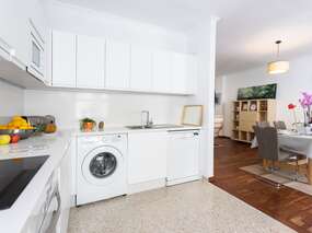 Die Ferienwohnung befindet sich im zweiten Stock und ist über einen Aufzug erreichbar. Das geräumige Wohnzimmer ist mit einem bequemen Sofa, gemütlichen Stühlen, Highspeed-WLAN (500 Mbps Glasfaser) und Smart TV ausgestattet. Direkt daneben befindet sich der Essbereich und eine offene, voll ausgestattete Küche. Diese ist mit neuen Geräten ausgestattet, darunter Geschirrspüler, Backofen, Toaster, Mixer, Kaffeemaschine und Waschmaschine – alles, was man braucht.