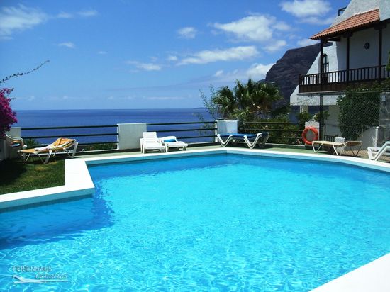 Der große Balkon, von dem aus man einen wunderschönen Blick auf den Atlantik, die Insel Gomera und die Steilküste, die berühmten "Acantilados de Los Gigantes" hat, ist mit Balkonmöbel und Sonnenliegen ausgestattet. Eine schattige zweite Terrasse befindet sich am Eingang zur Wohnung. Im traumhaften Garten stehen allen Gästen zwei Swimmingpools zu Verfügung.