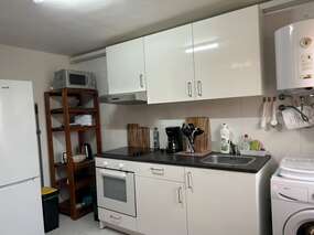 Die große Küche ist vollständig ausgestattet und verfügt unter anderem über eine Waschmaschine und alle notwendigen Küchenutensilien. Im Schlafzimmer sorgen ein Fenster und geräumige Schränke für eine angenehme Atmosphäre und ausreichend Stauraum. Das Badezimmer ist großzügig gestaltet und mit einer Badewanne ausgestattet.