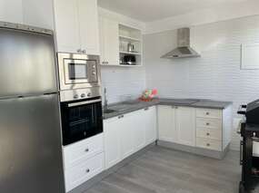 Die Küche und das Wohnzimmer bilden einen offenen Raum, in dem sich ein Essbereich befindet. Genießen Sie Ihre Lieblingsprogramme auf dem 55-Zoll-Smart-TV, während Sie sich auf Ihren bequemen Ledersofas ausruhen.