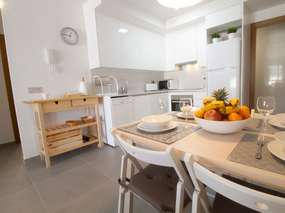 Die Ferienwohnung mit grosser Terrasse befindet sich im Erdgeschoß und ist modern eingerichtet. Wohnzimmer mit open space Küche, gemütliches Sofa, Fernseher und Glasfaser WiFi. Die Küche ist unter anderem mit Geschirrspueler, Kaffeemaschine, Toaster, Gefrierkombination, Mikrowelle, Dunstabzugshaube, etc... ausgestattet.