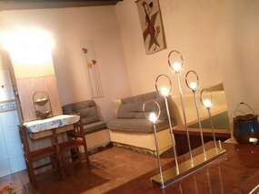 Der Wohn- und Essbereich grenzt dabei direkt an den Zugang zum Außenbereich und enthält neben einem gemütlichen Sofa einen Esstisch mit vier Stühlen. Die Küchenzeile ist offen im Wohnraum integriert und bietet alles, was Sie zum Kochen, benötigen: Geschirr, Besteck, Kochutensilien und den notwendigen Elektrogeräten auch eine Geschirrspülmaschine. Der Schlafbereich ist offen in den Wohnraum integriert, wie es in einem Studio der Fall ist, und besteht aus einem Doppelbett.