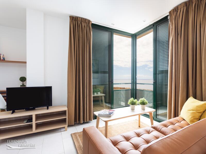 Diese Ferienwohnung verfügt über eine offene Küche und grossem Ess- / Wohnbereich. Ein Schlafzimmer mit Doppelbett mit Meerblick und Bad mit Badewanne. Sonne und Meerblick können vom dem Balkon genossen werden oder auch von der Sonnenterrasse mit Pool auf dem Dach.