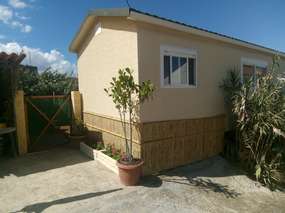 Kleines festes freistehendes Mobilhaus ( kein Wohnwagen ) mit überdachter Aussenküche, Essbereich, Terrasse mit Sitzecke, 2 Schlafzimmern, Wohnzimmer und Duschbad.