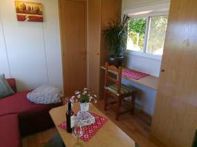 Kleines festes freistehendes Mobilhaus ( kein Wohnwagen ) mit überdachter Aussenküche, Essbereich, Terrasse mit Sitzecke, 1 Schlafzimmer, Wohnzimmer und Duschbad.
