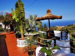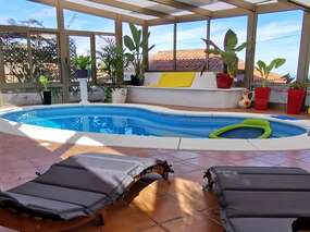 Es gibt verschiedene Terrassenbereiche, unter anderem auch ein überdachter Bereich und einen überdachten Pool der auf etwa 24-26° beheizt ist. Von der großen Terrasse hat man einen wunderbaren Meer & Teide-Blick.