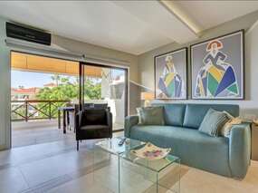 Die auf einer Fläche von 60 m2 große Wohnung besteht aus einem offenen Wohn-/Essbereich mit amerikanischer Küche, Schlafzimmer, Bad und einem Balkon mit Blick auf den Garten und teilweise aufs Meer. Machen Sie es sich gemütlich auf dem modischen Sofa und lassen Sie die Seele baumeln.