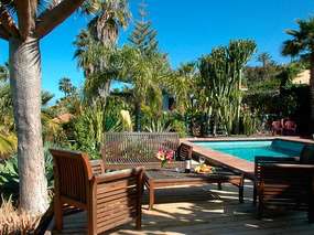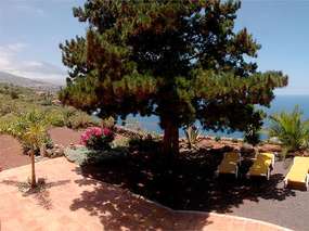 Die große Terrasse ist mit Tisch und Stühlen, Sonnenliegen und einem Grill ausgestattet. Diese bietet einen Panoramablick, über den Garten, auf den Atlantik und den Vulkan Teide. Zudem lockt der parkähnliche Garten, mit schönen Pool und faszinierendem Ausblicken.
