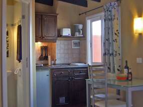 Die kleine Singelküche beinhaltet alles, was man im Urlaub braucht: Mikrowelle, Ceranfeld, Geschirr, Kaffeemaschine. Und auf Ihrer Terrasse mit Tisch und Stühle haben Sie einen eigenen gemauerten Grill.