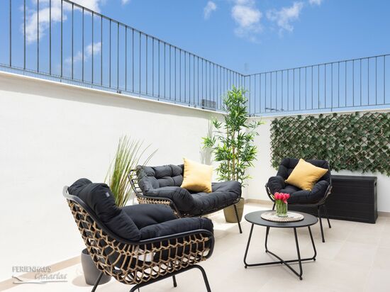 Hervorzuheben sind auch die beiden großzügigen Terrassen. Auf der vordere Terrasse haben Sie einen Essbereich und einen Gasgrill. Der Chill-out-Bereich auf der Terrasse der Rückseite wiederum, lädt Sie ein zu entspannen und das warme südliche Klima zu genießen.