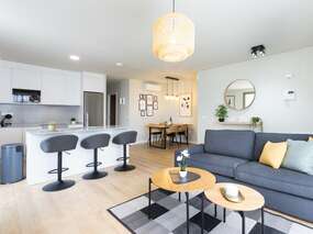 Die voll ausgestatteten Küche ist wie der Rest der Ferienwohnung im modernen Stil inklusive einer offenen Kücheninsel. Das Hauptschlafzimmer ist mit einem Doppelbett, bestehend aus 2 Betten je 0,90 Breite sowie einem Bad en suite mit Dusche und direkten Zugang zum Chill-out-Terrassen-Bereich. Das 2. Schlafzimmer ist mit 2 Einzelbetten, hier haben Sie Zugang zur hinteren Terrasse. Das 2. Bad ist mit Badewanne.