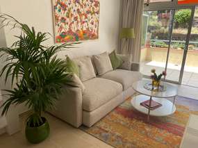 Moderne Wohnungseinrichtung mit schöner Kunst an den Wänden. Der Fernseher bietet deutsche sowie spanische Programme, die meisten in HD Qualität und viele Radioprogramme.