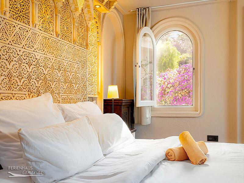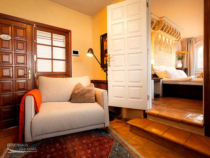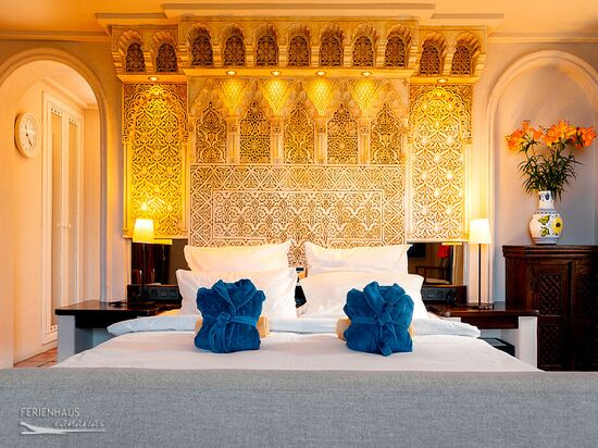 Das großzügige Schlafzimmer verfügt über ein Doppelbett samt Swiss-Flex-Gesundheitsschlafsystem und ein hochwertiges Sofa. Die marokkanischen Schnitzarbeiten runden das gehobene Ambiente in dem Wohn- / Schlafzimmer ab. Ein Smart SAT-TV, ermöglicht den Empfang der ASTRA-Fernsehund Radiokanäle (u.a. auch einige englisch und französisch sprachige).