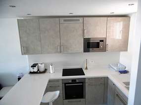 Im offenen Wohn- und Essbereich finden Sie auch die gut ausgestattete Küche. Eine Küchenbar mit passenden Hockern sorgt für optische Trennung vom Rest des Raumes. Die Küchenzeile ist mit einem Herd mit Backofen und Cerankochfeld, Mikrowelle eine große Kühl- und Gefrierkombination, Kaffeemaschine, Wasserkocher und Toaster, etc ausgestattet.