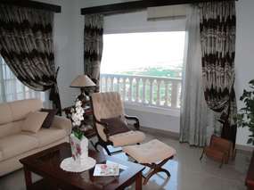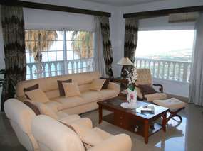 Die traditionelle Ferienwohnung bietet viel Komfort und mit 2 Schlafzimmer Platz für 4 Personen. Das Wohnzimmer mit Zugang zum Balkon hat zwei große Fenster, durch die man ebenfalls einen schönen Blick hat. Hier vor dem Fenster stehen die beiden Sofas.