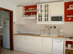 Im geräumigen Wohnzimmer steht ein Schlafsofa und eine moderne Kommode. Via Satellit kann man internationale und auch deutsches Fernsehen empfangen. Die Küche ist mit Ceranfeld, Kühl- Gefrierkombination, Mikrowelle sowie allen notwendigen Küchenutensilien ausgestattet. Im Schlafzimmer steht ein Doppelbett (ca. 1,50 x 1,90) und zwei Kinderbetten. Von der Terrasse hat man einen atemberaubenden Meerblick.