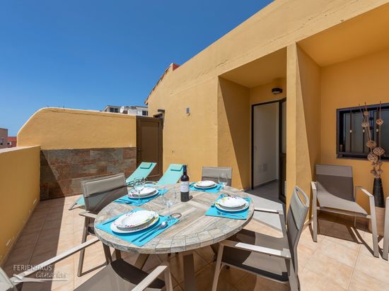 Penthouse Wohnung im Ortszentrum mit 3 Schlafzimmern, eines mit einem King Size Bett, das zweite mit einem Queen Size Bett, das dritte mit einem Einzelbett und einer bequemen Schlafcouch im Wohnzimmer, welches auch ein Esszimmer sowie ein moderne, voll ausgestattete Open Space Küche bietet. 1 Badezimmer mit gosser Dusche und im oberen Stockwerk, dass allerdings nur über eine Treppe zu erreichen ist die mit einem anderen Studio geteilt wird, befindet sich die Dachterrasse mit offener Sicht über die Dächer von El Medano, windgeschützt mit Sonnenliegen und Essbereich. Glasfaser Wifi und IP TV mit Kanälen aus der ganzen Welt stehen unseren Gästen auch zu Verfügung.