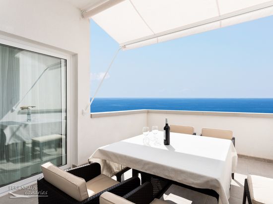 Zur Wohnung gehört eine möblierte Terrasse mit einem sensationellem Blick auf das Meer. Bei klarer Sicht sogar bis zur Nachbarinsel Gran Canaria..
