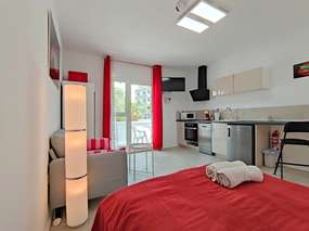 Das hier beschriebene Studio hat Wohnfläche von etwa 30 m² und ist modern, sowie hochwertig eingerichtet. Es gibt einen hellen Wohn-Schlafbereich mit Sofa, Smart-TV, einer Küchenzeile, einem Doppelbett und einem Badezimmer mit Dusche, Bidet und Waschmaschine.