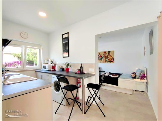 Die Küchenzeile ist gut zur Selbsversorgung eingerichtet: Induktionsherd mit kombiniertem Backofen, Toaster, Wasserkocher und Kaffeemaschine, Mikrowelle und vieles mehr...