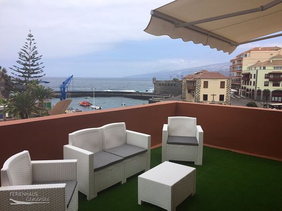 Zur Wohnung gehört eine große möblierte Terrasse mit Blick aufs Meer, auf die Stadt und die Berge - ideal für Urlauber, die den beliebten Urlaubsort Puerto de la Cruz und die Nähe zu Einkauf-und Ausgehmöglichkeiten bevorzugen.