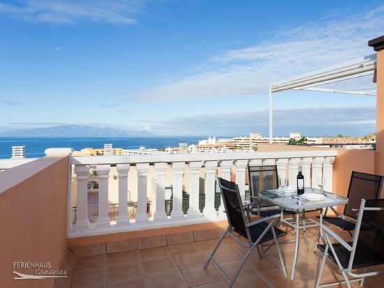 Vom Wohnzimmer aus gelangt man auch auf die möblierte Dachterrasse mit Tisch, Stühlen, Liegestühlen und wunderschönem Blick auf das Meer und die Insel La Gomera.