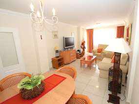 Die Wohnung ist schön eingerichtet mit einem Wohnraum mit einer Sofaecke für gemütliche Fernsehabende (SAT-TV) sowie einen Esstisch. Im Wohnzimmer aus kommen Sie auf Ihre große Sonnenterasse mit Gartenmöbeln. Die Küche ist ausgestattet mit einem Ceranfeld, Backofen, Mikrowelle, Spülmaschine, Kühl- und Gefrierschrank, Toaster, Kaffeemaschine, Wasserkocher und weiteren Utensilien zum Kochen.
